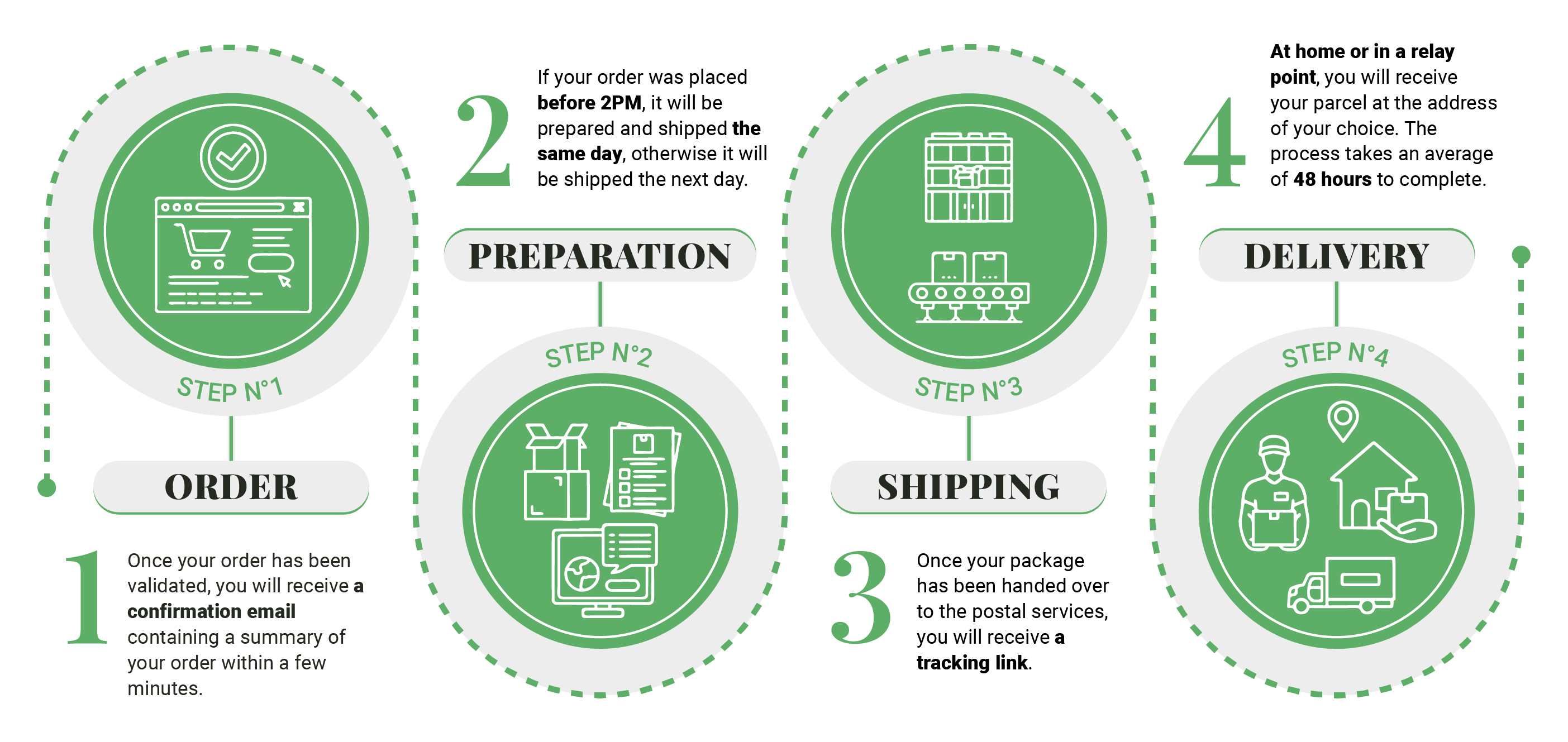For orders placed before 2 p.m., the package is shipped on the same day. However, please note that preparation times may take longer during periods of high order volumes or exceptional circumstances.